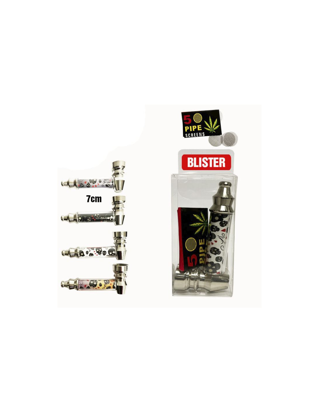La Mini Pipa Rasta es un accesorio compacto y decorativo de metal, con motivos de calaveras en colores aleatorios. Cada blister incluye 5 filtros metálicos, ideal para vending o como accesorio fumador. Su tamaño de 7 cm y medidas del blister de 8 x 3,4 x 2 cm la hacen fácil de transportar, almacenar y exponer. Inspirada en la tradición histórica de las pipas, ofrece una experiencia de uso cómoda y un sabor característico. Producto práctico, durable y de alta rotación, perfecto para clientes y negocios que buscan un artículo funcional y atractivo.