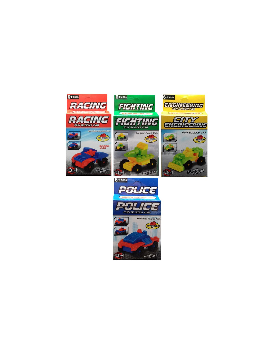 Los vehículos montables son: un coche de policía, un coche racing, un figthting (un vehículo de lucha) y un city engineering (una pala) que se enviararán aleatoriamente sgún stock.
