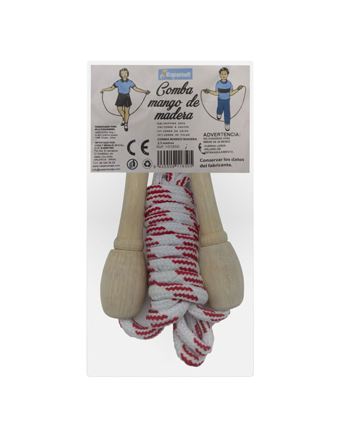 Comba con mango de madera y cuerda de poliéster. Cuerda de 2,5metros y de color roja y blanca.