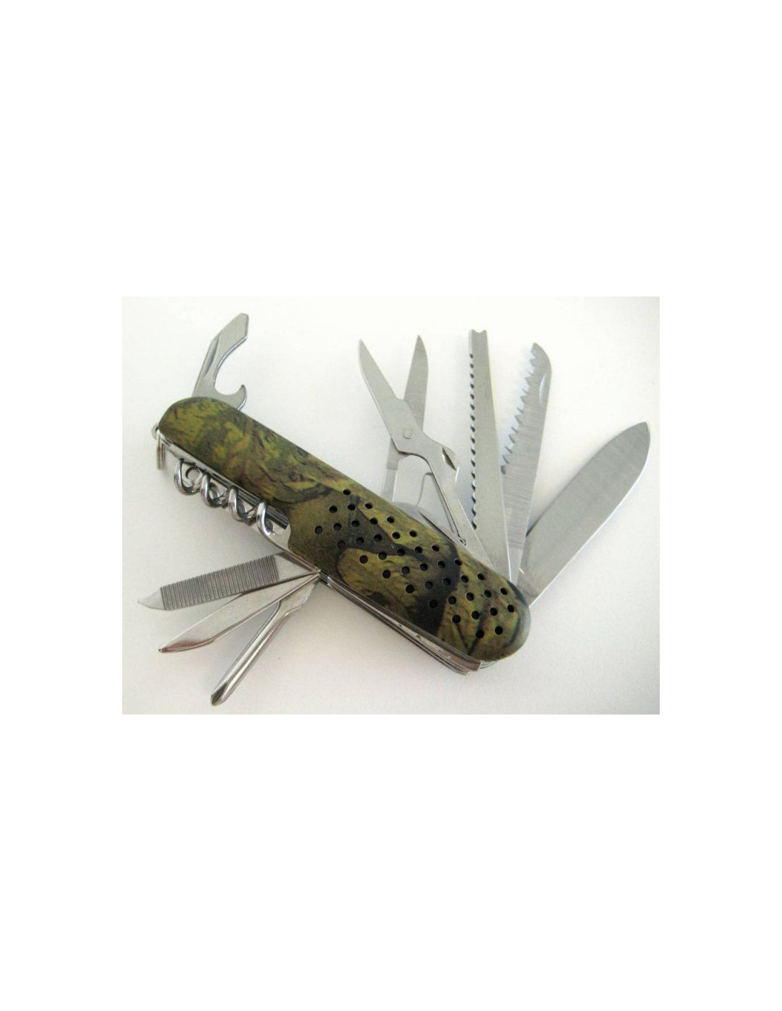 La Navaja Multiusos Camuflaje es un accesorio indispensable para quienes buscan versatilidad y preparación. Incluye 11 funciones esenciales: navaja, sierra, escalador de peces, tijeras, abrelatas, abrebotellas, destornillador ranurado, sacacorchos, aguja, limas y destornillador, asegurando que siempre tengas la herramienta adecuada a mano.