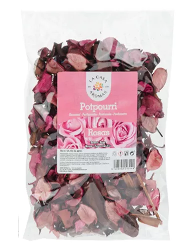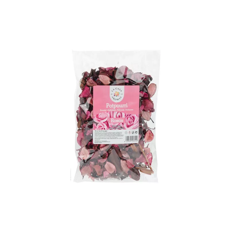En la bolsita de potpourri vas a encontrar una mezcla de hojas y flores naturales secas y virutas de madera perfumadas con el aroma a rosas.