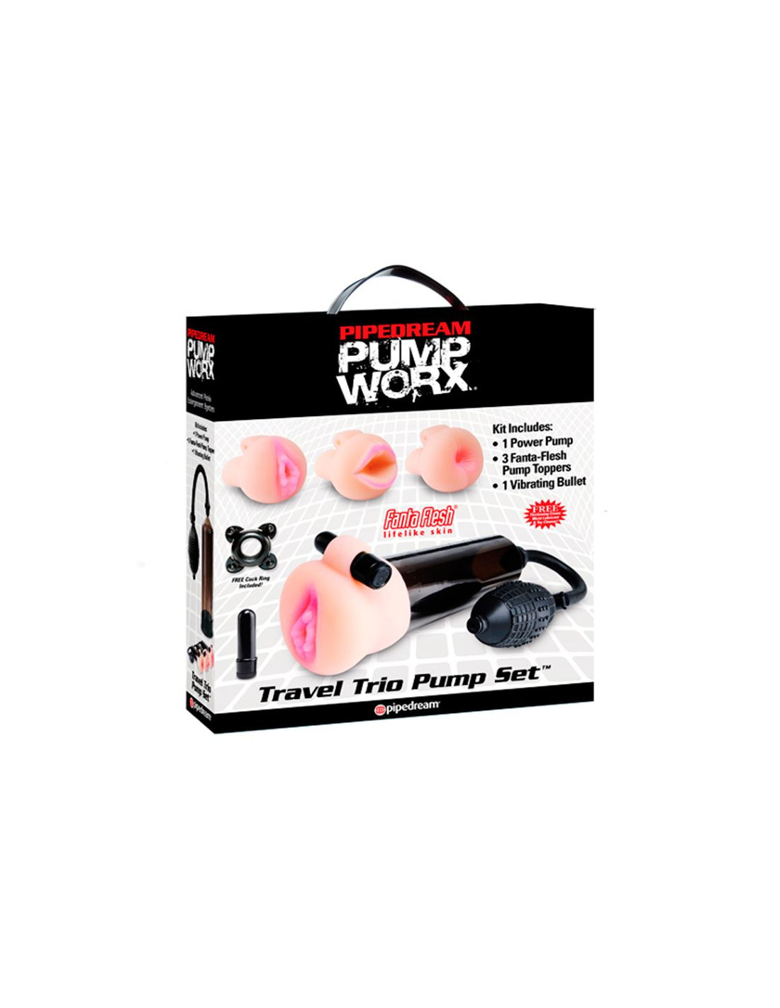 Compuesto por 9 piezas, incluye: una bomba succionadora para principiantes, tres cabezales Fanta-Flesh con formas vaginal, anal y oral, una bala vibradora resistente al agua, un anillo ajustable para prolongar la erección y muestras gratuitas de lubricante, jabón limpiador y crema espesante. Los cabezales Fanta-Flesh se acoplan fácilmente, proporcionando una experiencia envolvente y realista.