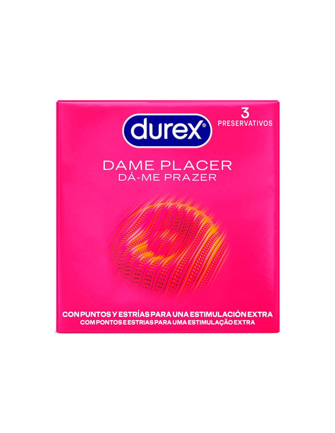 Durex Dame Placer es un preservativo de látex con puntos y estrías diseñados para maximizar el placer de la pareja. Gracias a la posición de sus puntos y estrías, ofrece más placer para ambos durante la relación.